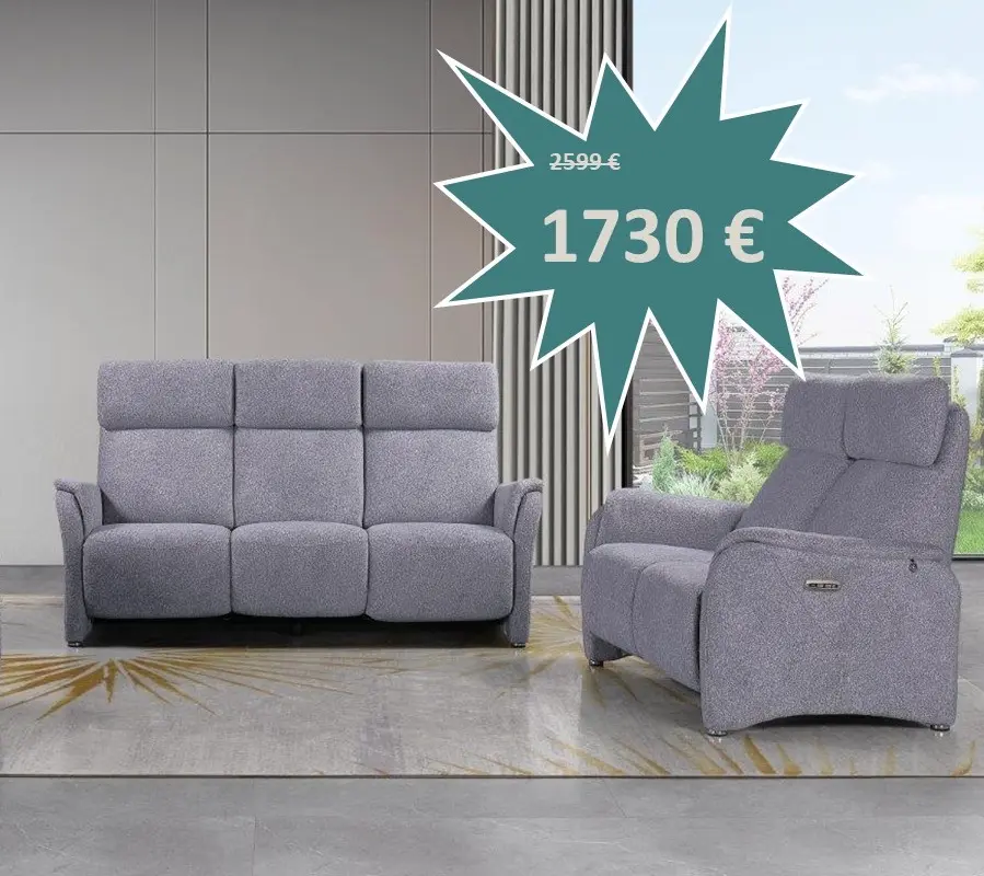 Salon Liz en tissu composé d'un canapé 3 places avec 2 relax électriques à 2 moteurs et un canapé 2 places au prix de 1880 € à la place de 2575€