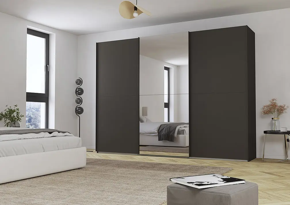 Armoire Marcato en 240 x 69 x H.223 cm avec une porte miroir au centre et 2 portes en verre extérieurs.