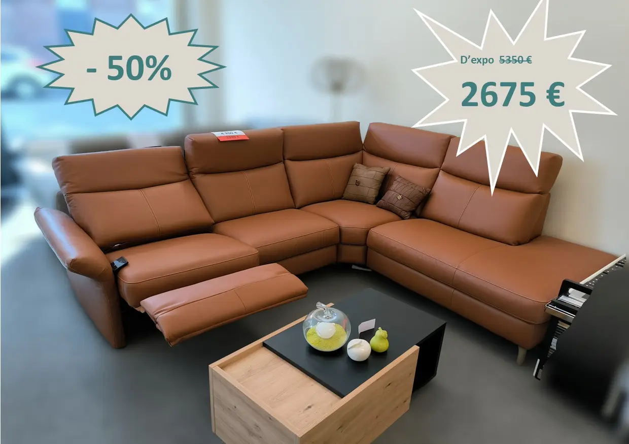 Salon d'angle Sella en cuir camel en 260 x 220 cm avec 1 relax électrique au prix de 2675 €
