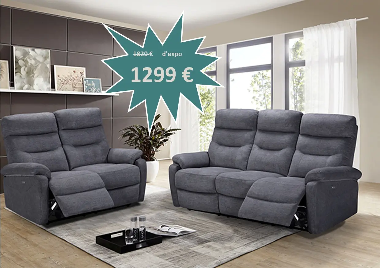 Salon Lota en tissu microfibre composé d'un canapé 3 places avec 2 relax électriques et un canapé 2 places fixes au prix de 1299 €