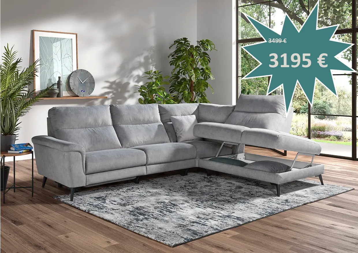 Salon d'angle Edward en tissu microfibre avec 2 relax électriques et coffre de rangement au prix de 3195 €