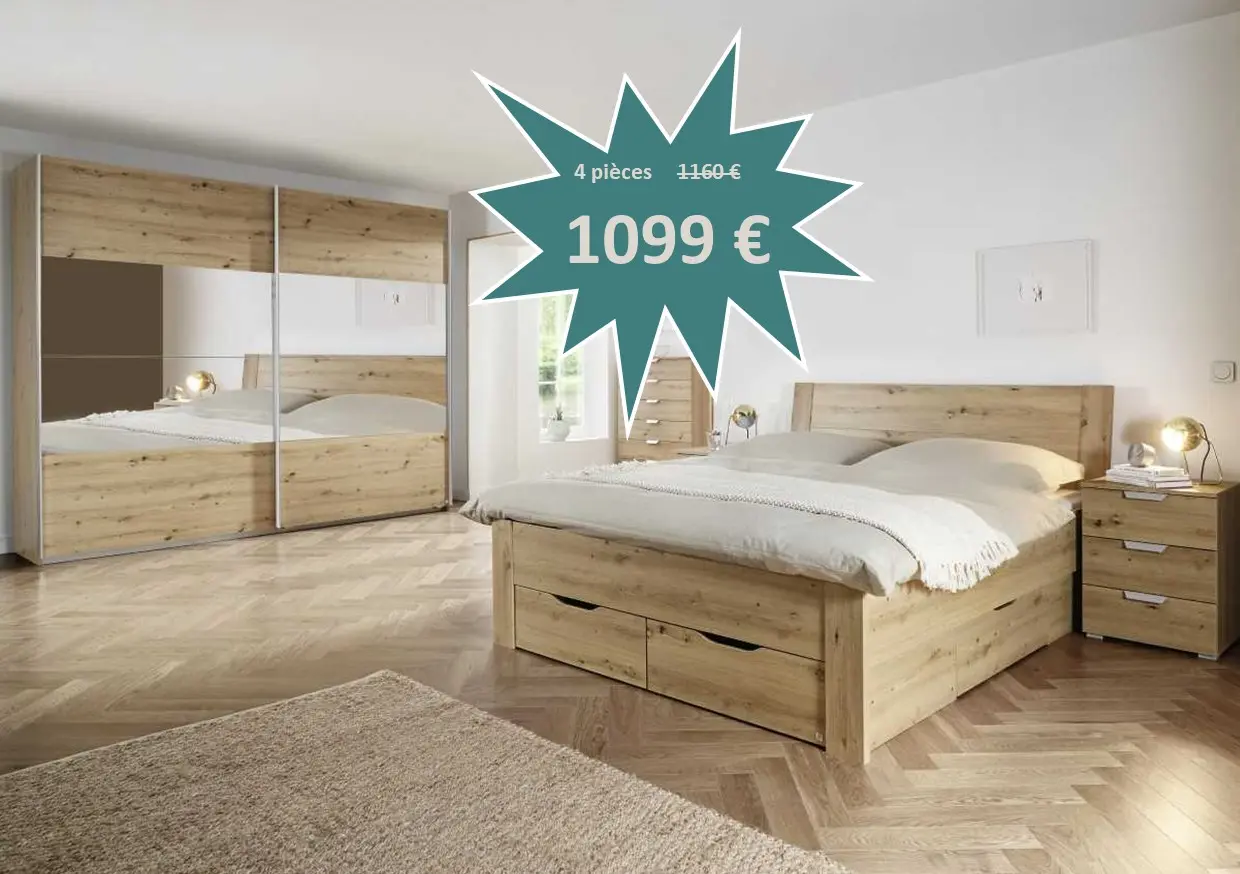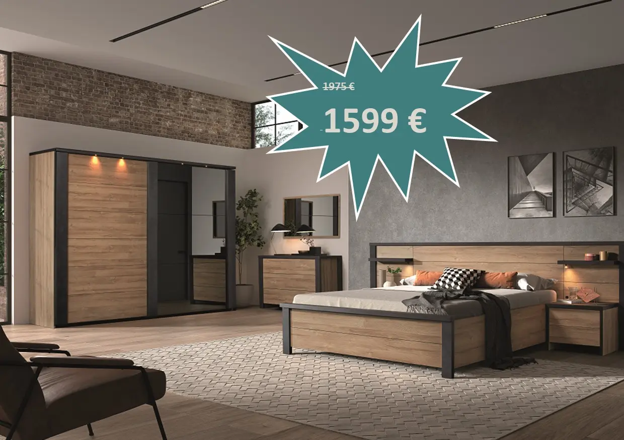 Chambre Phaedra comprenant le lit en 160cm avec traverses, 2 chevets et la garde-robes en 217 cm au prix de 1599 €