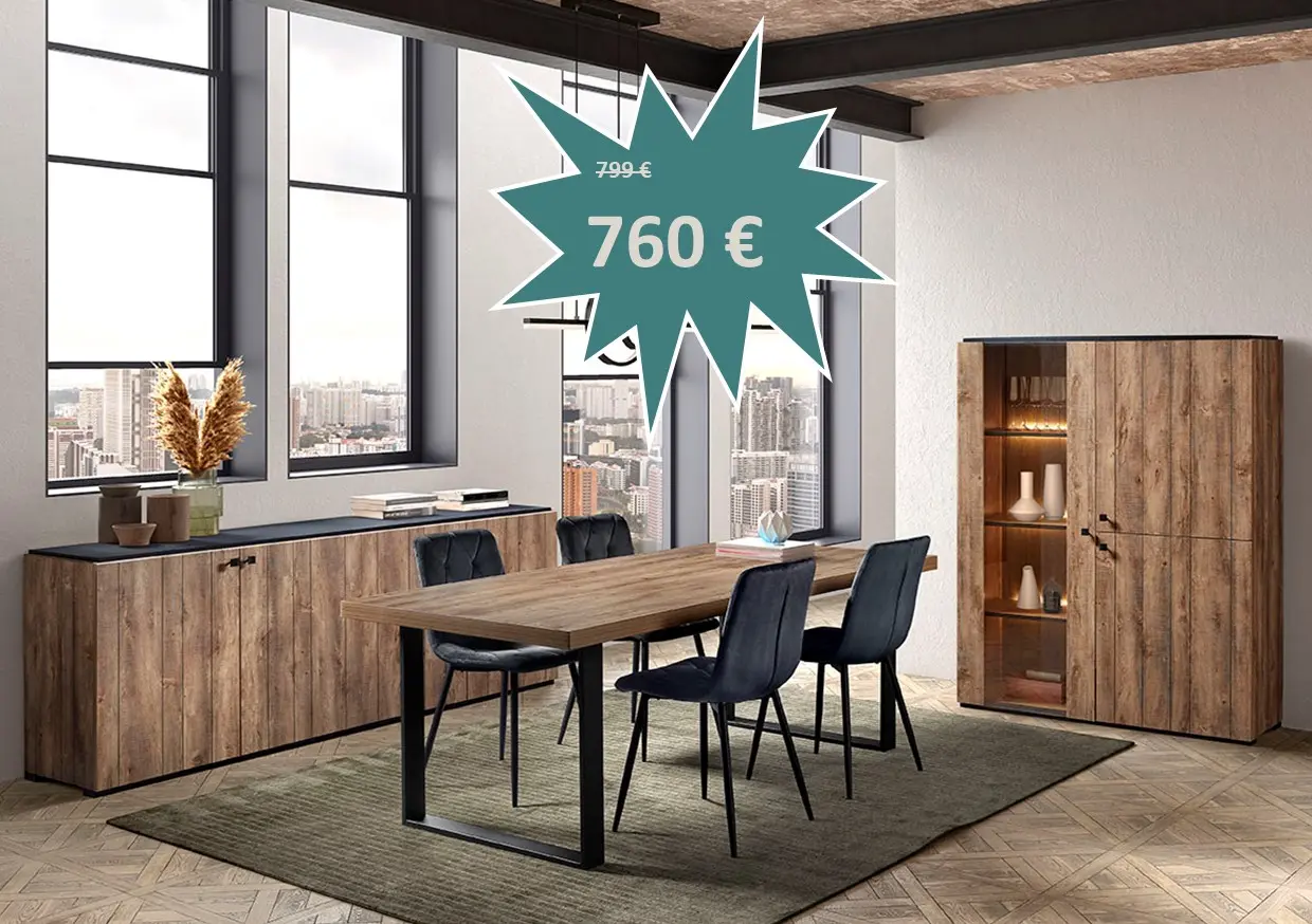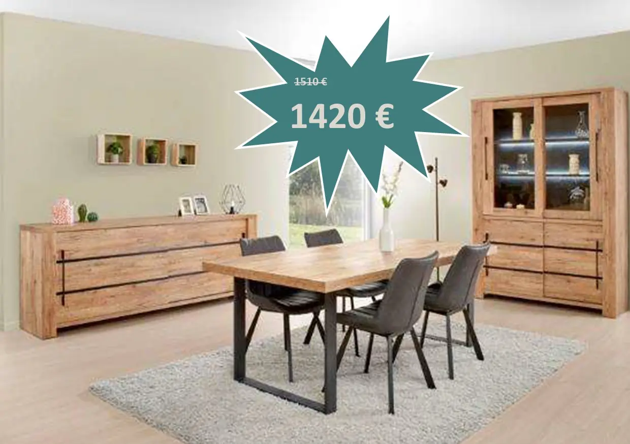 Salle à manger Rico comprenant le dressoir en 182 cm, la vitrine et la table au prix de 1599 €