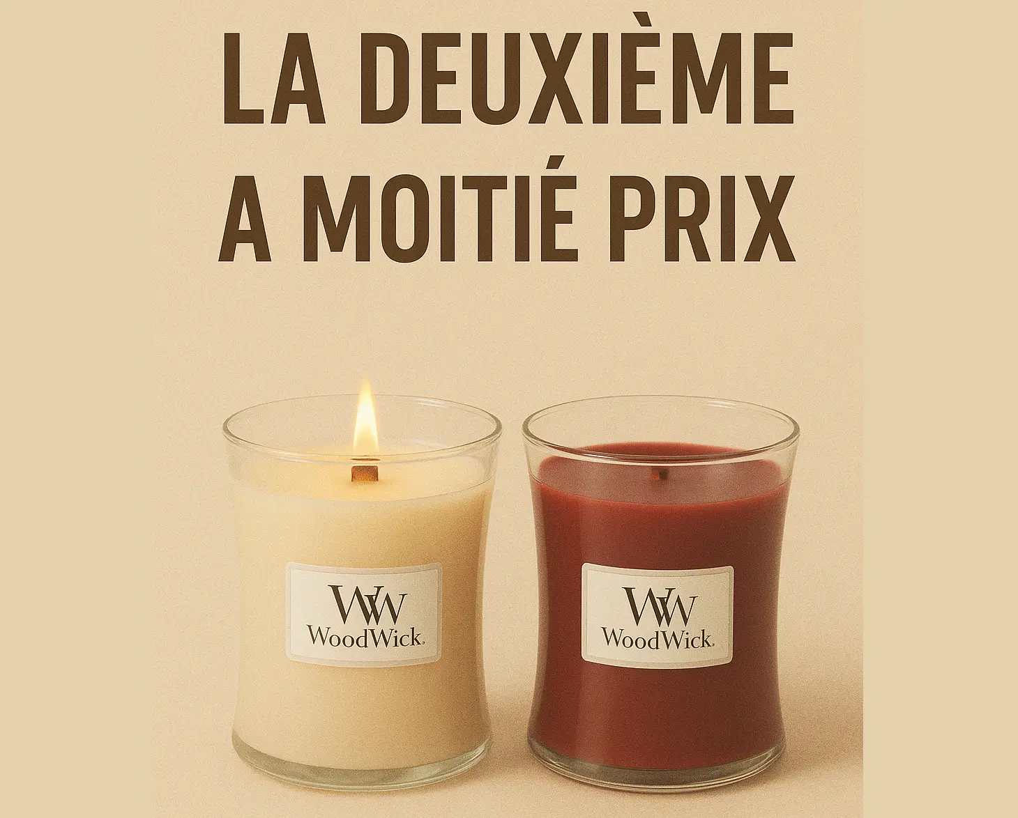 Profitez de 50% de réduction sur la deuxième bougies Wood Wick achetées. Venez dans notre magasin découvrir des dizaines de parfum dans différents formats.