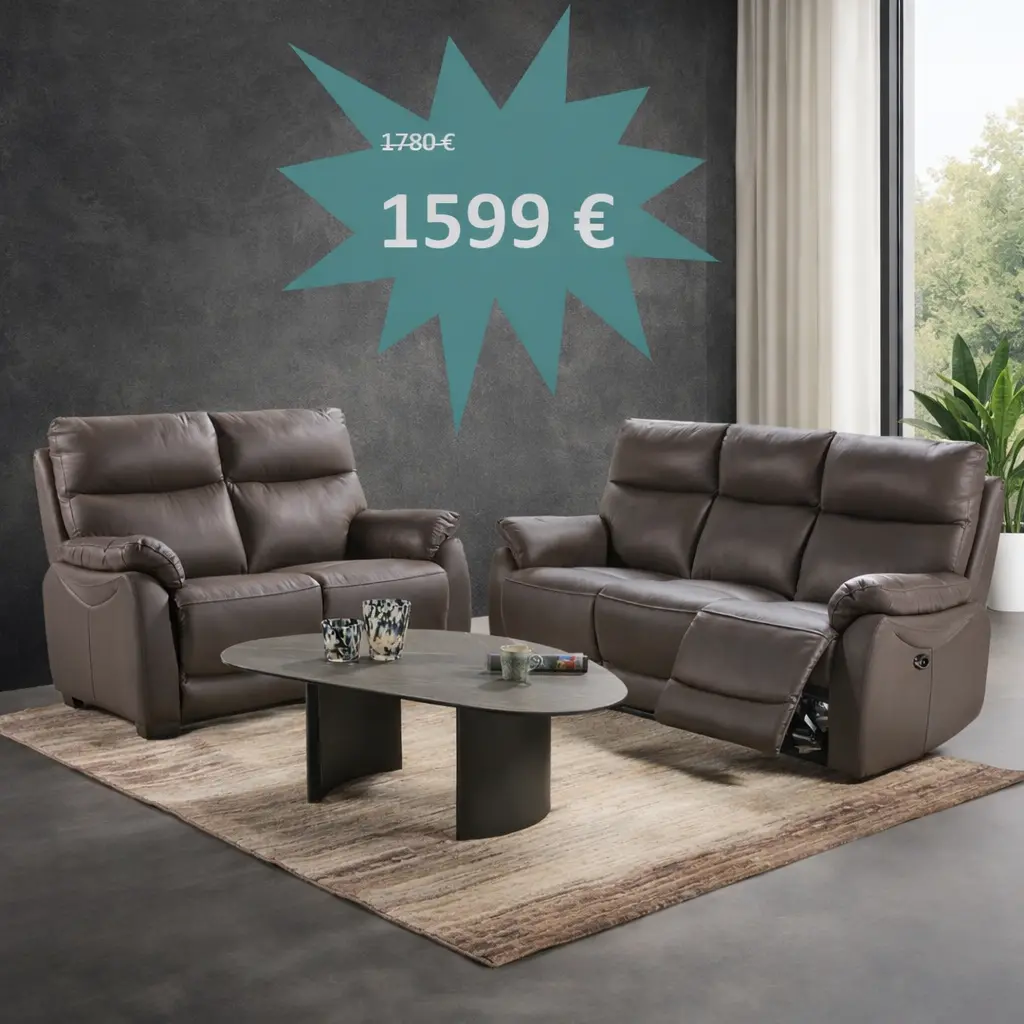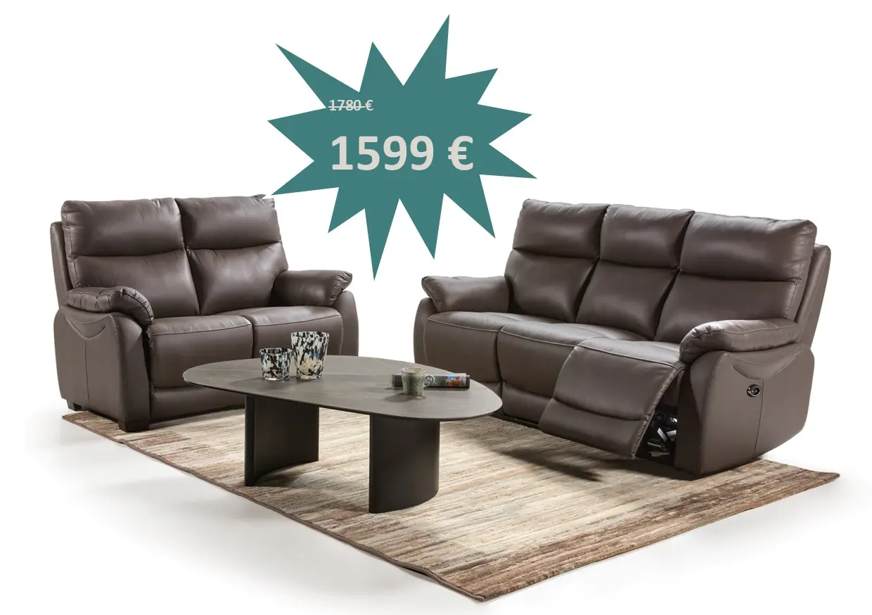 Salon Bruno en cuir et simili cuir composé d'un canapé 3 places avec 2 relax électriques et un canapé 2 places fixes au prix de 1599 €