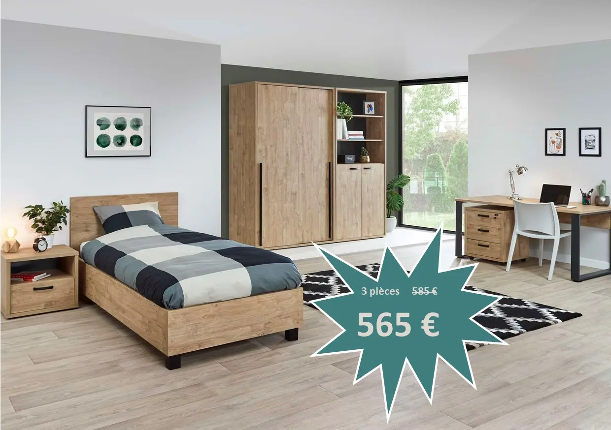 Chambre Casper comprenant le lit 1 personne, 1 chevet et la garde-robes à 2 portes coulissantes en 120 cm au prix de 565 €