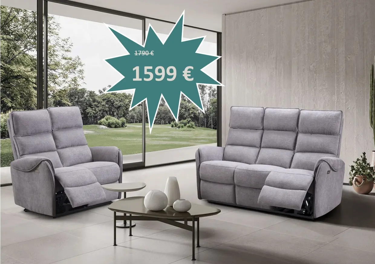 Salon Monza en tissu microfibre composé d'un canapé 3 places avec 2 relax électriques et un canapé 2 places fixes au prix de 1599 €