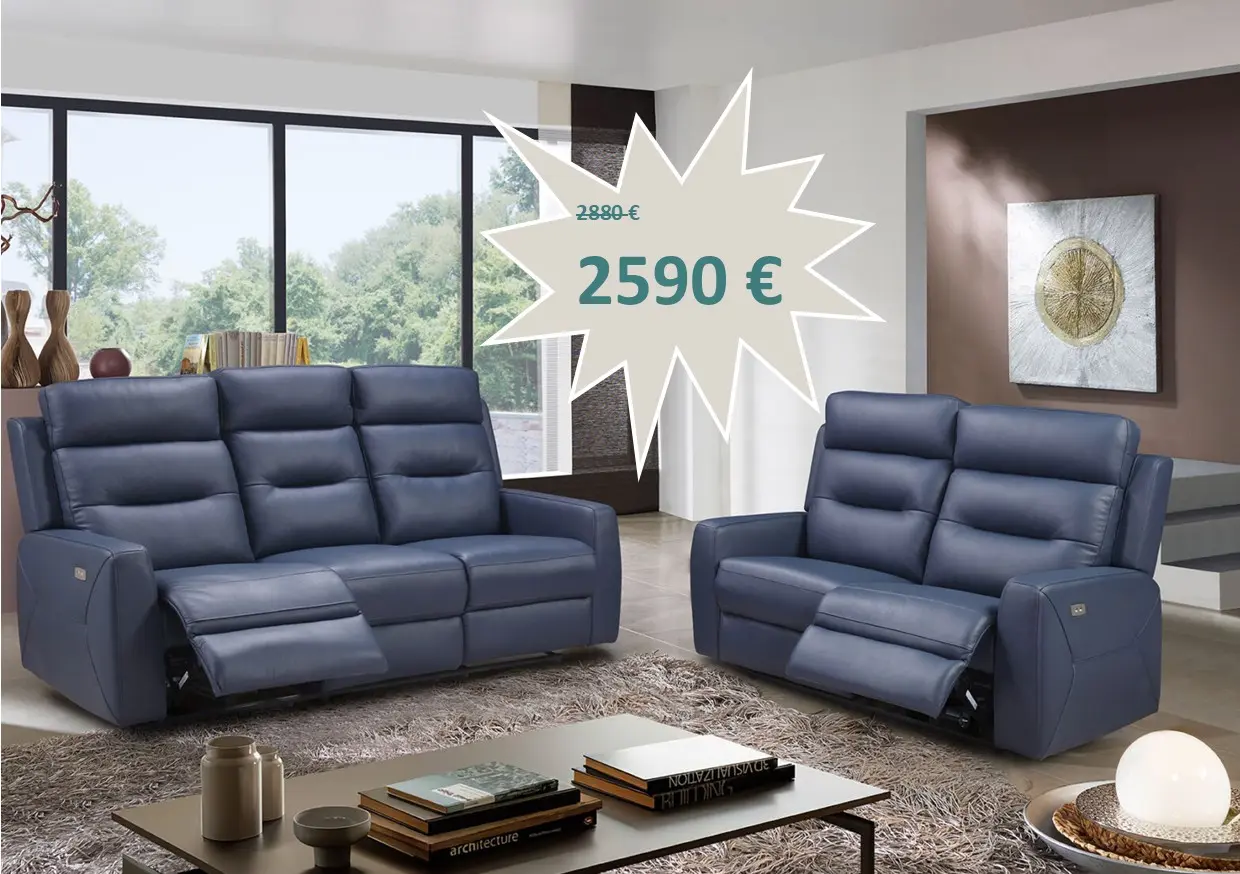 Salon Estella en cuir composé d'un canapé 3 places avec 2 relax électriques et un canapé 2 places au prix de 2590 €