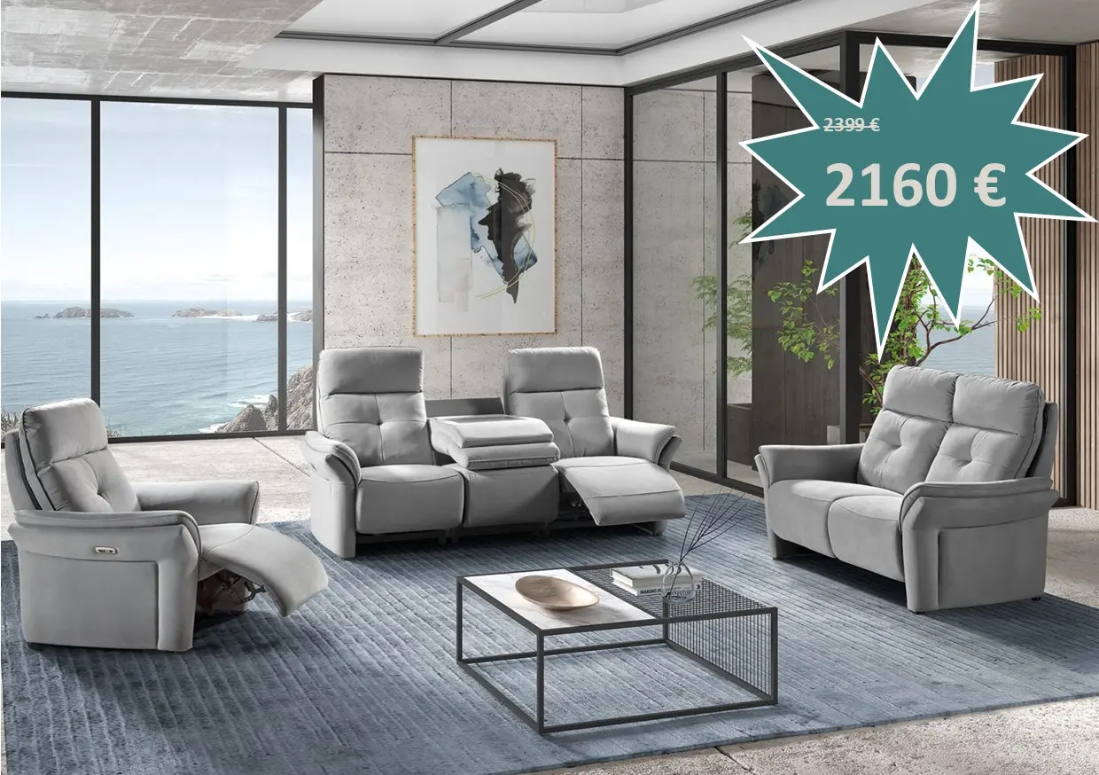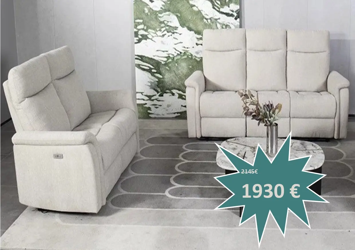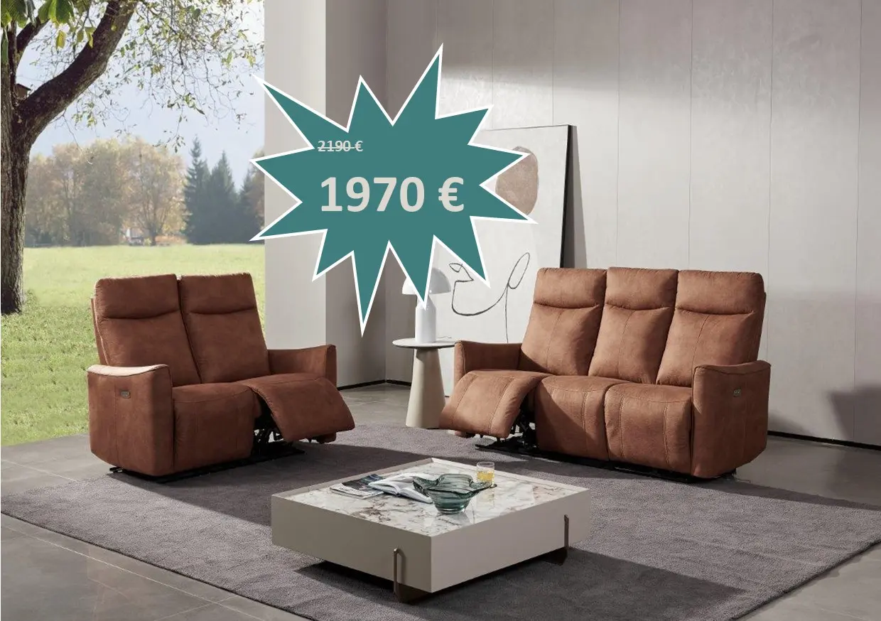 Salon Tilda en tissu microfibre composé d'un canapé 3 places avec 2 relax électriques et un canapé 2 places fixe au prix de 2160 €