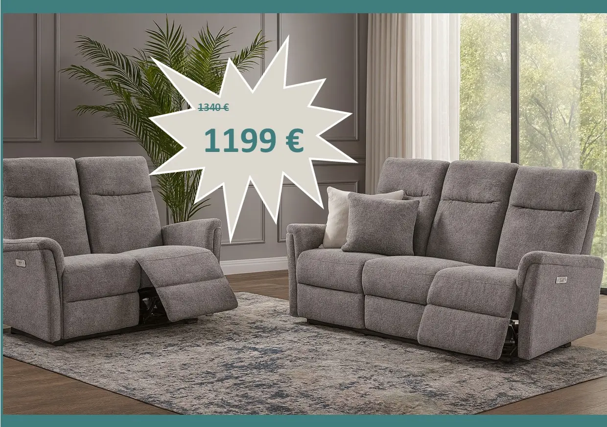 Salon Wallet en tissu gris composé d'un canapé 3 places avec 2 relax électriques et un canapé 2 places fixe au prix de 2250 € à la place de 3260 €